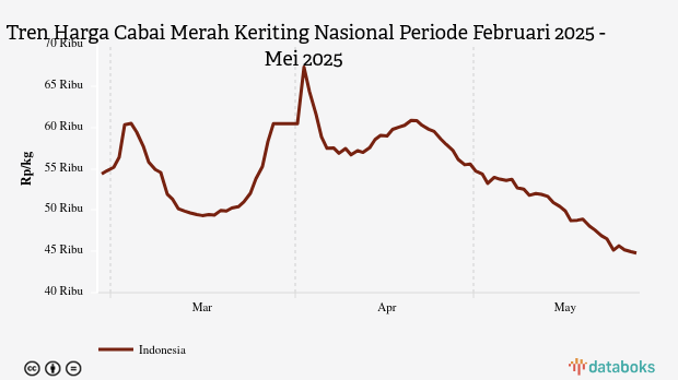 Selama periode Februari 2025 - Mei 2025, rata-rata harga cabai merah terendah Rp44.791 per kg pada Rabu, 28 Mei 2025. Adapun harga tertinggi mencapai Rp67.297 per kg pada Rabu, 2 April 2025.