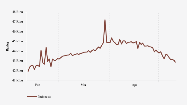 Berdasarkan data tingkat provinsi, harga komoditas ini bervariasi dengan kisaran Rp37.849 - Rp45.471 per kg.