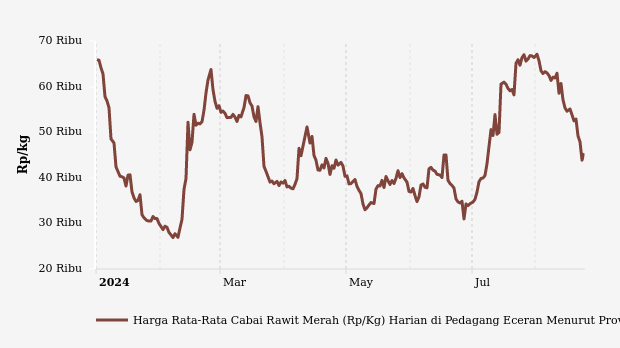 Sepanjang 2024, rata-rata harga cabai rawit terendah Rp26.900 per kg pada Rabu, 7 Februari 2024. Adapun harga tertinggi mencapai Rp66.980 per kg pada Jumat, 26 Juli 2024.