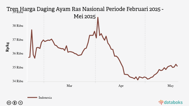 Selama periode Februari 2025 - Mei 2025, rata-rata harga daging ayam terendah Rp34.210 per kg pada Kamis, 24 April 2025. Adapun harga tertinggi mencapai Rp38.537 per kg pada Rabu, 2 April 2025.