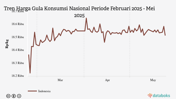Selama periode Februari 2025 - Mei 2025, rata-rata harga gula terendah Rp18.369 per kg pada Sabtu, 22 Februari 2025. Adapun harga tertinggi mencapai Rp18.650 per kg pada Rabu, 2 April 2025.