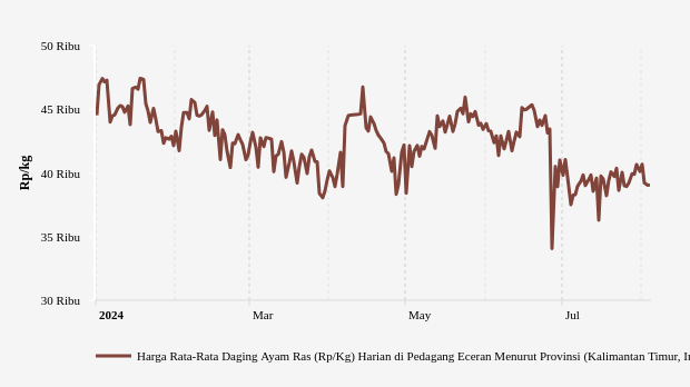 Menurut data harga pangan eceran Badan Pangan Nasional (Bapanas) pada Minggu (4/8/2024) pukul 14.51 WIB, harga daging ayam di Kalimantan Timur mencapai Rp39.050 per kg.