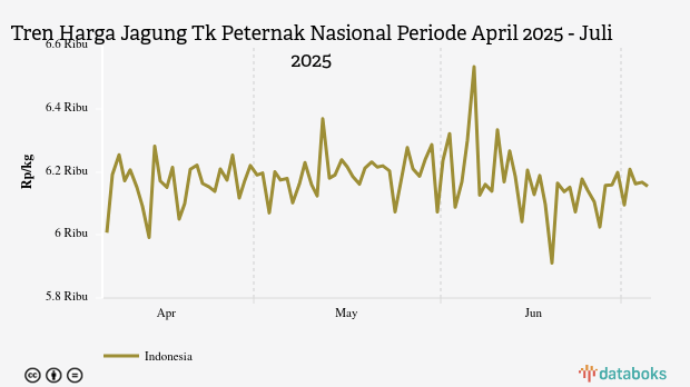Selama periode April 2025 - Juli 2025, rata-rata harga jagung terendah Rp6.050 per kg pada Jumat, 18 April 2025. Adapun harga tertinggi mencapai Rp6.533 per kg pada Jumat, 6 Juni 2025.