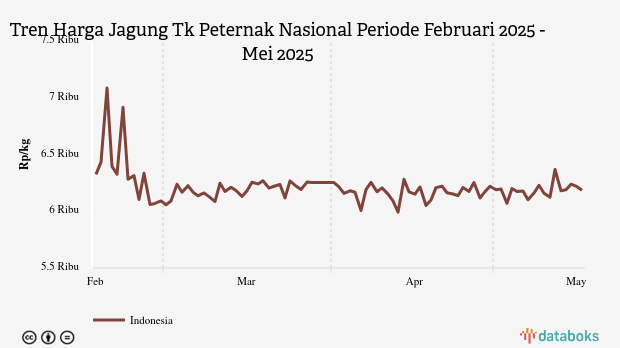 Selama periode Februari 2025 - Mei 2025, rata-rata harga jagung terendah Rp6.050 per kg pada Jumat, 18 April 2025. Adapun harga tertinggi mencapai Rp6.465 per kg pada Sabtu, 15 Februari 2025.
