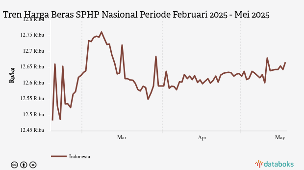 Selama periode Februari 2025 - Mei 2025, rata-rata harga beras SPHP terendah Rp12.505 per kg pada Senin, 17 Februari 2025. Adapun harga tertinggi mencapai Rp12.762 per kg pada Sabtu, 8 Maret 2025.
