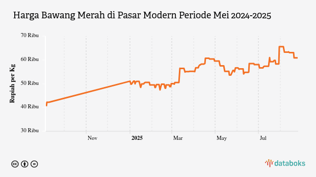 Adapun terhadap harga sebulan terakhir, perkembangan harga bawang merah harian di pasar modern mengalami kenaikan dari sebelumnya yang tercatat sebesar Rp57,35 ribu per kg.