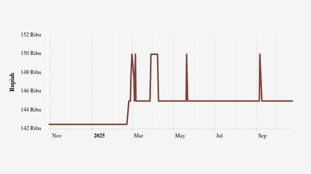 Sedangkan harga daging sapi kualitas 2 harian di pasar tradisional dalam tiga bulan terakhir di Sumatera Barat terlihat turun 0%. Menurut catatan historis harga pangan di panel harga PIHPS, harga daging sapi kualitas 2 harian di pasar tradisional provinsi Sumatera Barat diperdagangkan di harga Rp145 ribu.