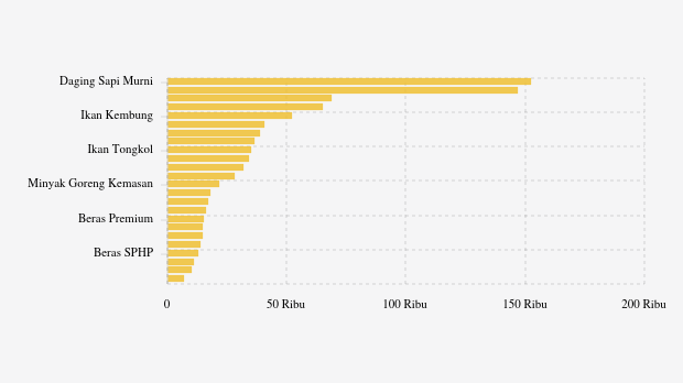 Komoditas ikan bandeng naik paling tinggi Rp692 (1,73%) menjadi Rp40.712 per kg. Adapun harga cabai rawit merah turun paling tajam Rp2.500 (6,06%) menjadi Rp38.750 per kg.