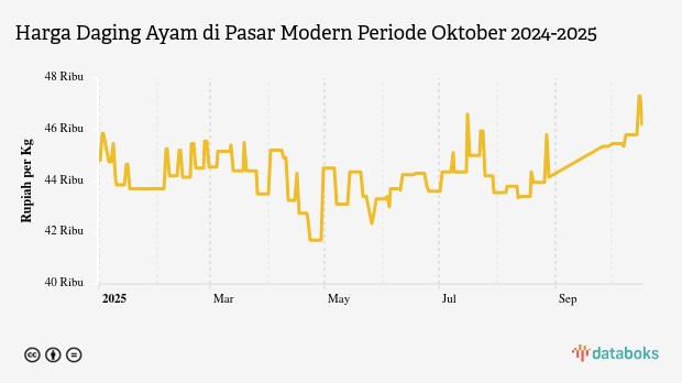 Adapun terhadap harga sebulan terakhir, perkembangan harga daging ayam harian di pasar modern mengalami kenaikan dari sebelumnya yang tercatat sebesar Rp43,8 ribu per kg.