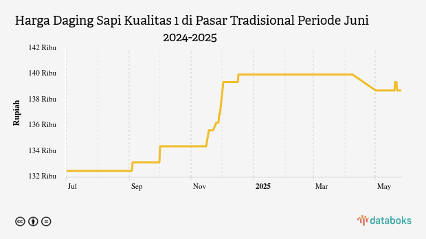 Adapun terhadap harga sebulan terakhir, perkembangan harga daging sapi kualitas 1 harian di pasar tradisional mengalami penurunan dari sebelumnya yang tercatat sebesar Rp140 ribu .