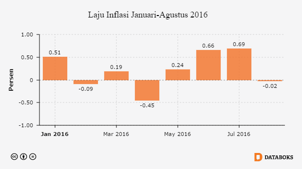 Penurunan harga untuk kelompok bahan makanan dan kelompok transportasi, komunikasi serta jasa keuangan telah memicu terjadinya deflasi 0,02 persen pada Agustus 2016. Ini merupakan deflasi untuk yang ketiga kalinya sepanjang 2016. Deflasi tertinggi terjadi di Kupang sebesar 0,87 persen. Sementara inflasi tertinggi terjadi di Sorong dan Manokwari sebesar 1,27 persen. Hingga Agustus 2016, inflasi tahun kalender tercatat 1,74 persen sedangkan laju inflasi tahunan (YoY) sebesar 2,79 persen.