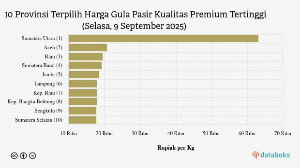 Harga gula pasir kualitas premium harian di pasar modern Sumatera Utara menjadi yang termahal se-Indonesia dengan harga jual Rp.63.100 per kg. Dibandingkan sebulan lalu, harga gula pasir kualitas premium di provinsi ini lebih tinggi. Sebelumnya tercatat pada angka 19.150 per kg.