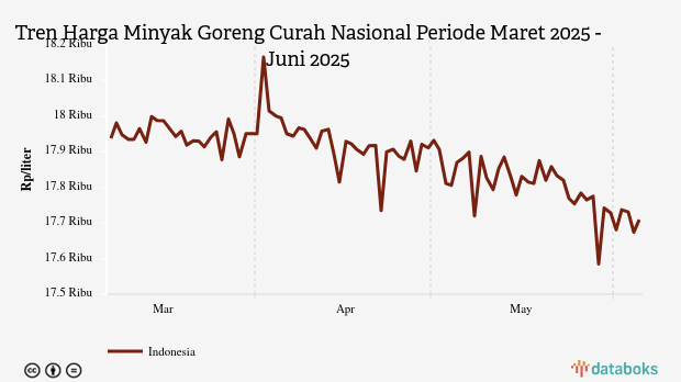 Selama periode Maret 2025 - Juni 2025, rata-rata harga minyak goreng curah terendah Rp17.674 per liter pada Rabu, 4 Juni 2025. Adapun harga tertinggi mencapai Rp18.166 per liter pada Rabu, 2 April 2025.