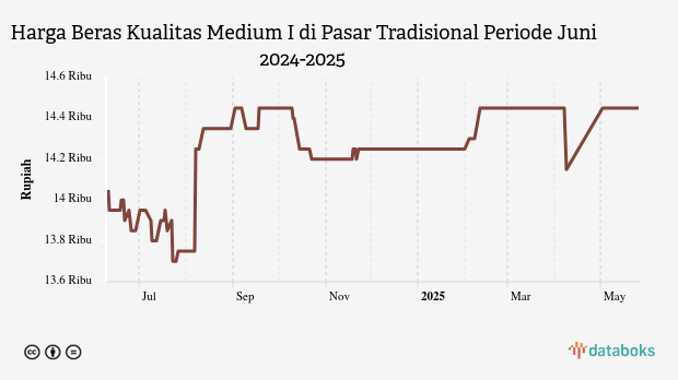 Adapun terhadap harga sebulan terakhir, perkembangan harga beras kualitas medium I harian di pasar tradisional tidak mengalami perubahan dari sebelumnya yang tercatat sebesar Rp14,45 ribu .