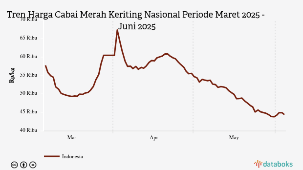 Selama periode Maret 2025 - Juni 2025, rata-rata harga cabai merah terendah Rp43.891 per kg pada Jumat, 30 Mei 2025. Adapun harga tertinggi mencapai Rp67.297 per kg pada Rabu, 2 April 2025.