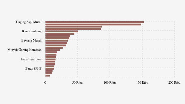 Komoditas daging kerbau segar (lokal) naik paling tinggi Rp5.500 (3,86%) menjadi Rp148.000 per kg. Adapun harga ikan bandeng turun paling tajam Rp719 (1,84%) menjadi Rp38.451 per kg.