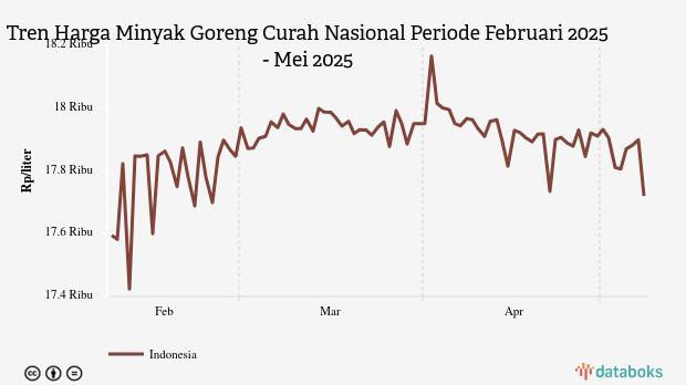 Selama periode Februari 2025 - Mei 2025, rata-rata harga minyak goreng curah terendah Rp17.720 per liter pada Kamis, 8 Mei 2025. Adapun harga tertinggi mencapai Rp18.166 per liter pada Rabu, 2 April 2025.