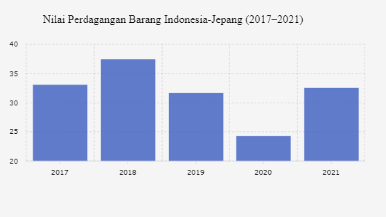 Nilai perdagangan barang Indonesia dan Jepang tumbuh 33,54% ke US$ 32,49 miliar pada tahun 2021 dari tahun sebelumnya, menurut data Perserikatan Bangsa-Bangsa