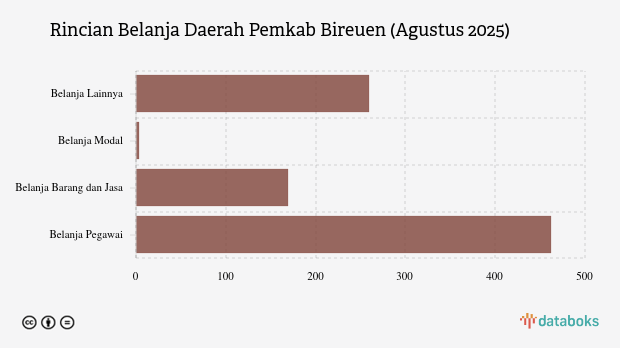 Selama periode Januari 2025 hingga Agustus 2025, realisasi Belanja Daerah Pemkab Bireuen mencapai Rp894,77 miliar atau setara 44,6% dari anggaran Belanja Daerah 2025.