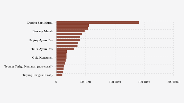 Komoditas yang naik harga yaitu cabai merah keriting, daging sapi murni, tepung terigu kemasan (non-curah), telur ayam ras, dan cabai rawit merah.