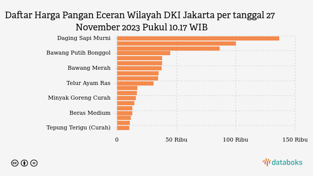- Daging Sapi Murni: Rp136.580 per kg (turun Rp850)