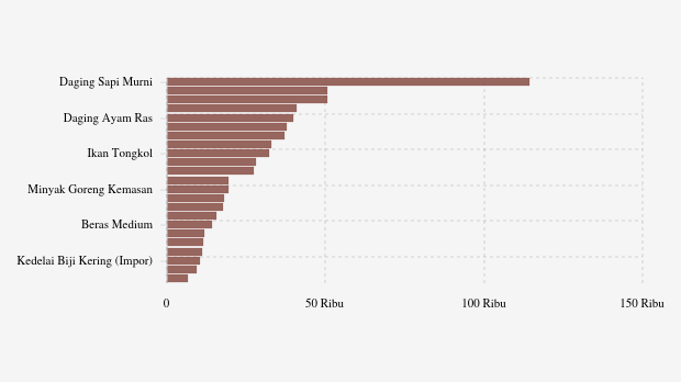 Komoditas kedelai biji kering (impor) melonjak paling tinggi Rp178 (1,56%) menjadi Rp11.578 per kg. Adapun harga bawang putih bonggol turun paling tajam Rp1.448 (3,89%) menjadi Rp35.760 per kg.