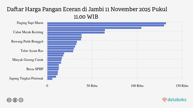 - Daging Sapi Murni: Rp134.545 per kg (turun 0,34%)