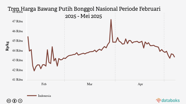 Selama periode Februari 2025 - Mei 2025, rata-rata harga bawang putih terendah Rp42.397 per kg pada Selasa, 11 Februari 2025. Adapun harga tertinggi mencapai Rp45.389 per kg pada Rabu, 2 April 2025.