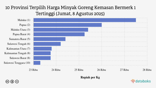 Kemudian di urutan ketiga, harga minyak goreng kemasan bermerk 1 di Maluku Utara seharga Rp.25.400 per kg, Papua Barat Rp.25.250 per kg, dan Sumatera Barat Rp.24.400 per kg.