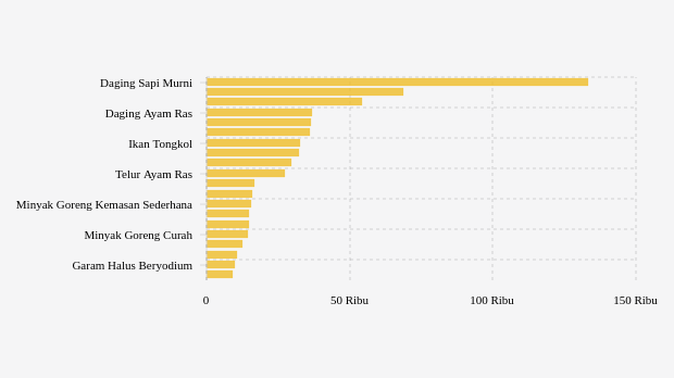 - Daging Sapi Murni: Rp133.280 per kg (naik 0,19%)