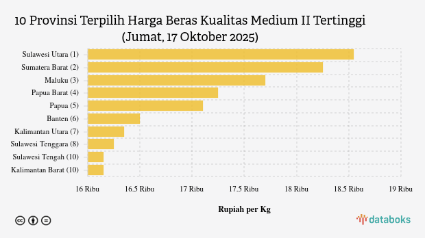 Pusat Informasi Harga Pangan Strategis Nasional mencatat rata-rata harga beras kualitas medium II (per kg) harian di pasar modern di beberapa provinsi telah menyentuh angka Rp.15,88 ribu per kg, data per Jumat, 17 Oktober 2025. Secara keseluruhan, rata-rata minggu ini naik dibandingkan rata-rata minggu sebelumnya yang tercatat Rp.15,87 ribu per kg.