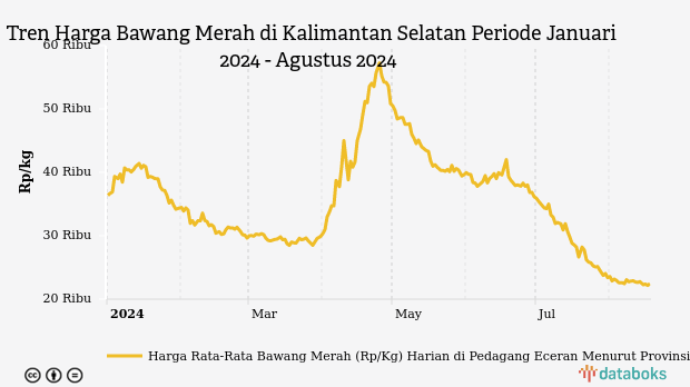 Sepanjang 2024, rata-rata harga bawang merah terendah Rp22.170 per kg pada Sabtu, 17 Agustus 2024. Adapun harga tertinggi mencapai Rp57.250 per kg pada Kamis, 25 April 2024.