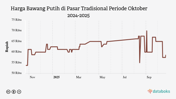 Sedangkan harga bawang putih harian di pasar tradisional dalam tiga bulan terakhir di Maluku Utara terlihat turun 4,08%. Menurut catatan historis harga pangan di panel harga PIHPS, harga bawang putih harian di pasar tradisional provinsi Maluku Utara diperdagangkan di harga Rp61,25 ribu.