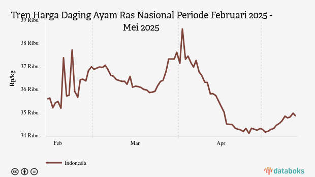 Selama periode Februari 2025 - Mei 2025, rata-rata harga daging ayam terendah Rp34.210 per kg pada Kamis, 24 April 2025. Adapun harga tertinggi mencapai Rp38.537 per kg pada Rabu, 2 April 2025.