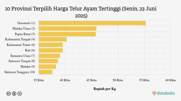 Harga telur ayam harian di pasar modern Gorontalo menjadi yang termahal se-Indonesia dengan harga jual Rp.55.250 per kg. Dibandingkan sebulan lalu, harga telur ayam di provinsi ini tidak mengalami perubahan. Harga jual tertinggi yang pernah dicatat di wilayah ini adalah Rp.55.250 per kg.