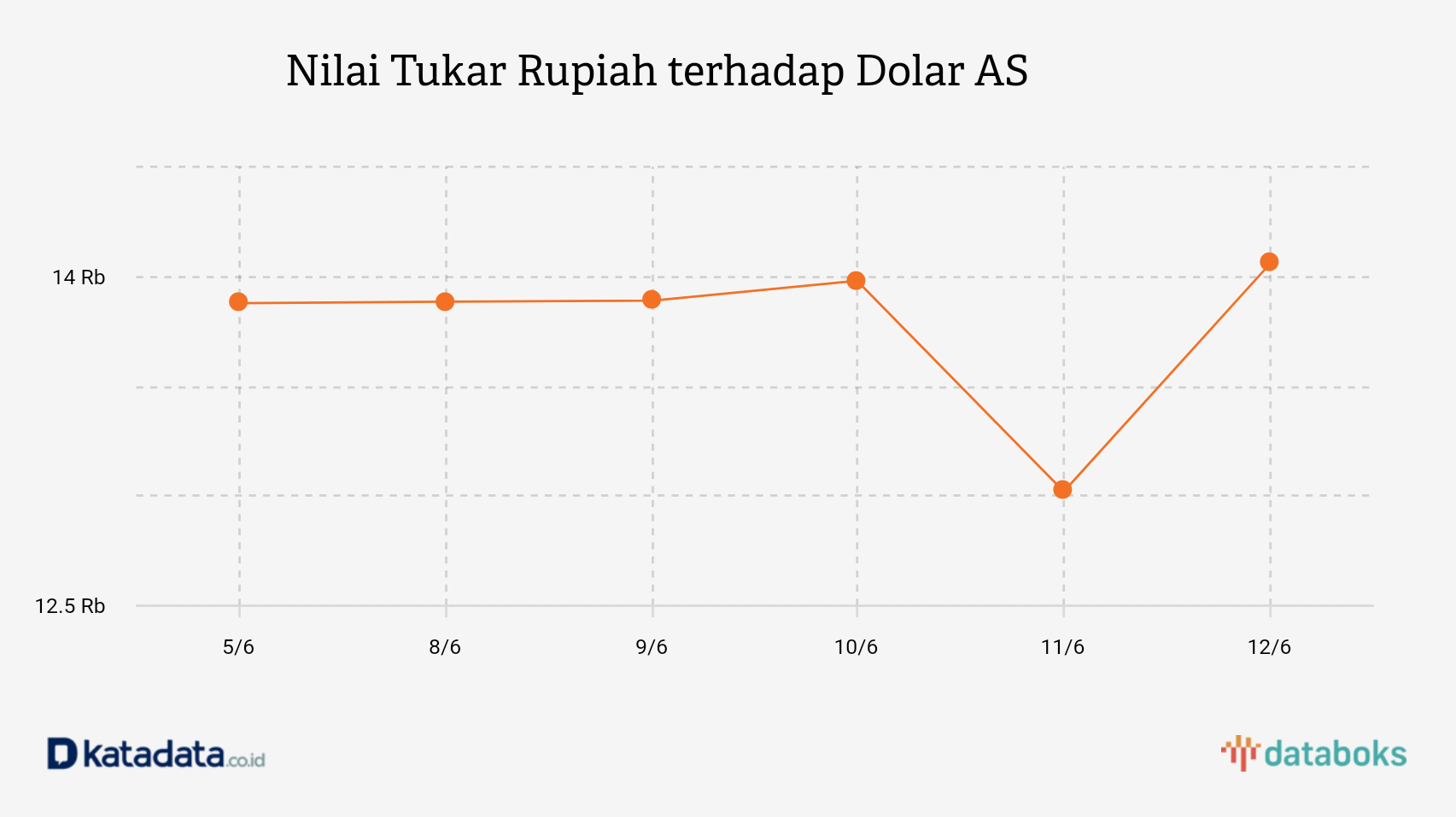 Rupiah dibuka melemah pada perdagangan Jumat, 12/6 ke level Rp 14.060 per dolar. Mengutip Bloomberg, rupiah menjadi mata uang yang mengalami pelemahan tertinggi di Asia. Pelemahan selanjutnya terjadi pada mata uang ringgit Malaysia 0,67%, yuan Tiongkok 0,29%, dan rupee India 0,25%.