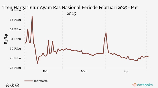 Selama periode Februari 2025 - Mei 2025, rata-rata harga telur ayam terendah Rp28.764 per kg pada Rabu, 23 April 2025. Adapun harga tertinggi mencapai Rp30.242 per kg pada Rabu, 2 April 2025.