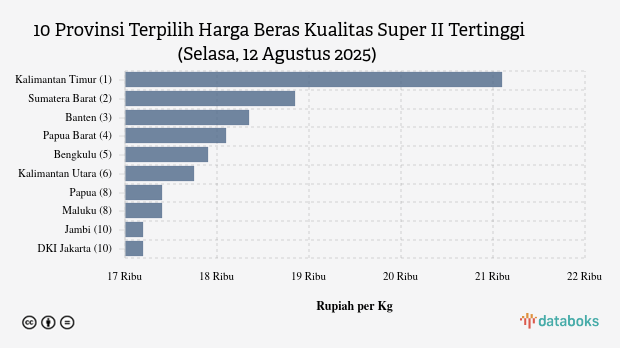 Harga beras kualitas super II harian di pasar modern Kalimantan Timur menjadi yang termahal se-Indonesia dengan harga jual Rp.21.100 per kg. Dibandingkan sebulan lalu, harga beras kualitas super II di provinsi ini tidak mengalami perubahan. Harga jual tertinggi yang pernah dicatat di wilayah ini adalah Rp.21.650 per kg.