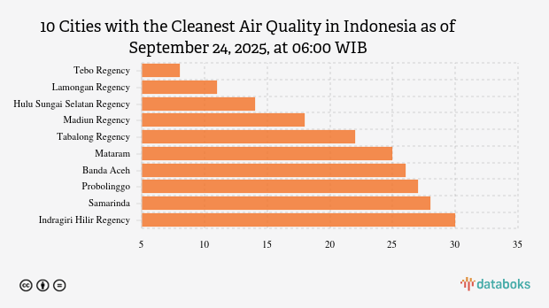 Tebo Regency''s air quality this morning is the cleanest in Indonesia. Based on the air quality index from the Ministry of Environment and Forestry (KLHK), Tebo Regency scored 8 on Wednesday (24/9/2025) at 06:00 WIB.