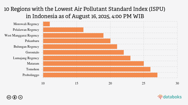 At that time, Morowali Regency's air quality was classified as good, meaning that pollutant levels in Morowali Regency's air were very minimal. Furthermore, Pelalawan Regency ranked second with an air quality index of 16. Next, West Manggarai Regency was in third position with an air quality index of 19.