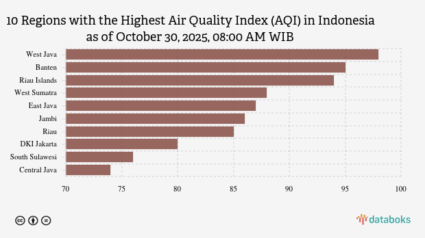 Air quality in West Java this morning is the worst in Indonesia. Based on the Air Pollution Standard Index (ISPU) page of the Ministry of Environment and Forestry (KLHK) on Thursday (Oct 30, 2025) at 08:00 AM WIB, it was revealed that the air quality index in West Java was 98.