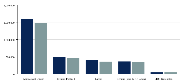 For public sector workers, the target was 334,750 people. The first dose vaccination reached 494,340 people (147.67% of the target), and the second dose reached 139.28% of the target, with 466,260 doses administered.