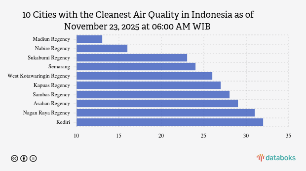 The following is a list of the 10 cities with the cleanest air quality in Indonesia according to KLHK on Sunday, November 23, 2025 at 06:00 AM WIB.