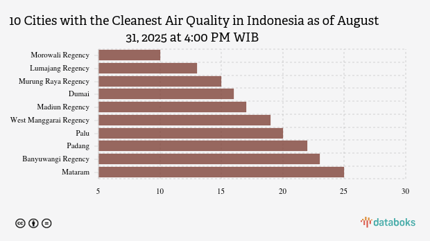 Here is a list of the 10 cities with the cleanest air quality in Indonesia according to KLHK on Sunday, August 31, 2025, at 4:00 PM WIB.