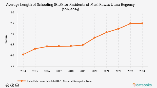 The average length of schooling (RLS) for residents aged 25 and over in Musi Rawas Utara, South Sumatra, was 7.51 years in 2024.
