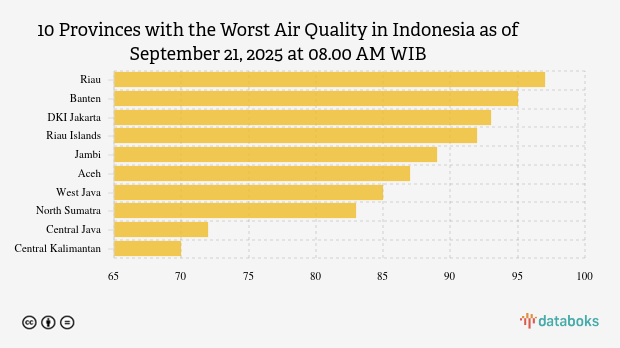 Here is a list of the 10 provinces with the worst air quality index in Indonesia on Sunday, September 21, 2025, at 08.00 AM WIB.