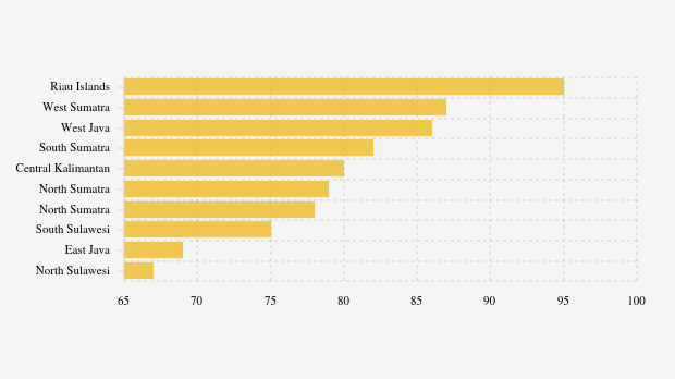 Below the Riau Islands, West Sumatra ranks second worst in Indonesia with an air quality index of 87. Then, West Java is in third place with an air quality index of 86.