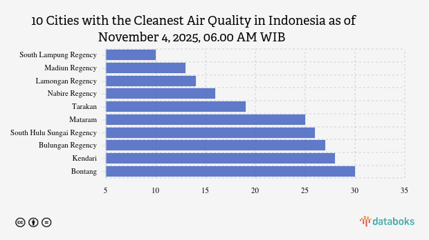 Here is the complete list of the 10 cities with the cleanest air quality in Indonesia according to KLHK on Tuesday, November 4, 2025, at 06.00 AM WIB.