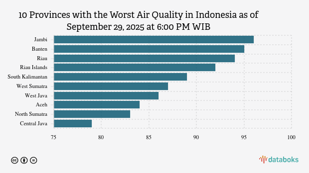 Here is a list of the 10 provinces with the worst air quality index in Indonesia on Monday, September 29, 2025, at 6:00 PM WIB.