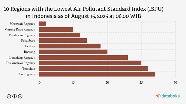 At that time, Morowali Regency's air quality was categorized as good, meaning the pollutant levels in Morowali Regency's air were very minimal. Furthermore, Murung Raya Regency ranks second with an air quality index of 15. Next, Pelalawan Regency is in third position with an air quality index of 16.